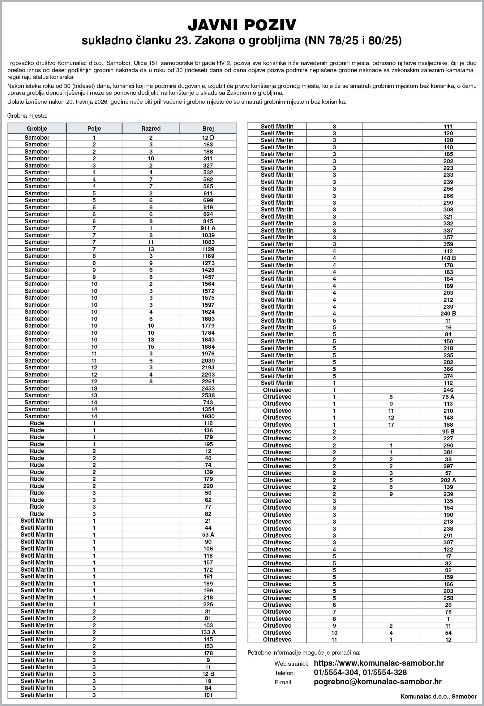 Javni poziv sukladno članku 23. Zakona o grobljima (NN 78/25 i 80/25)